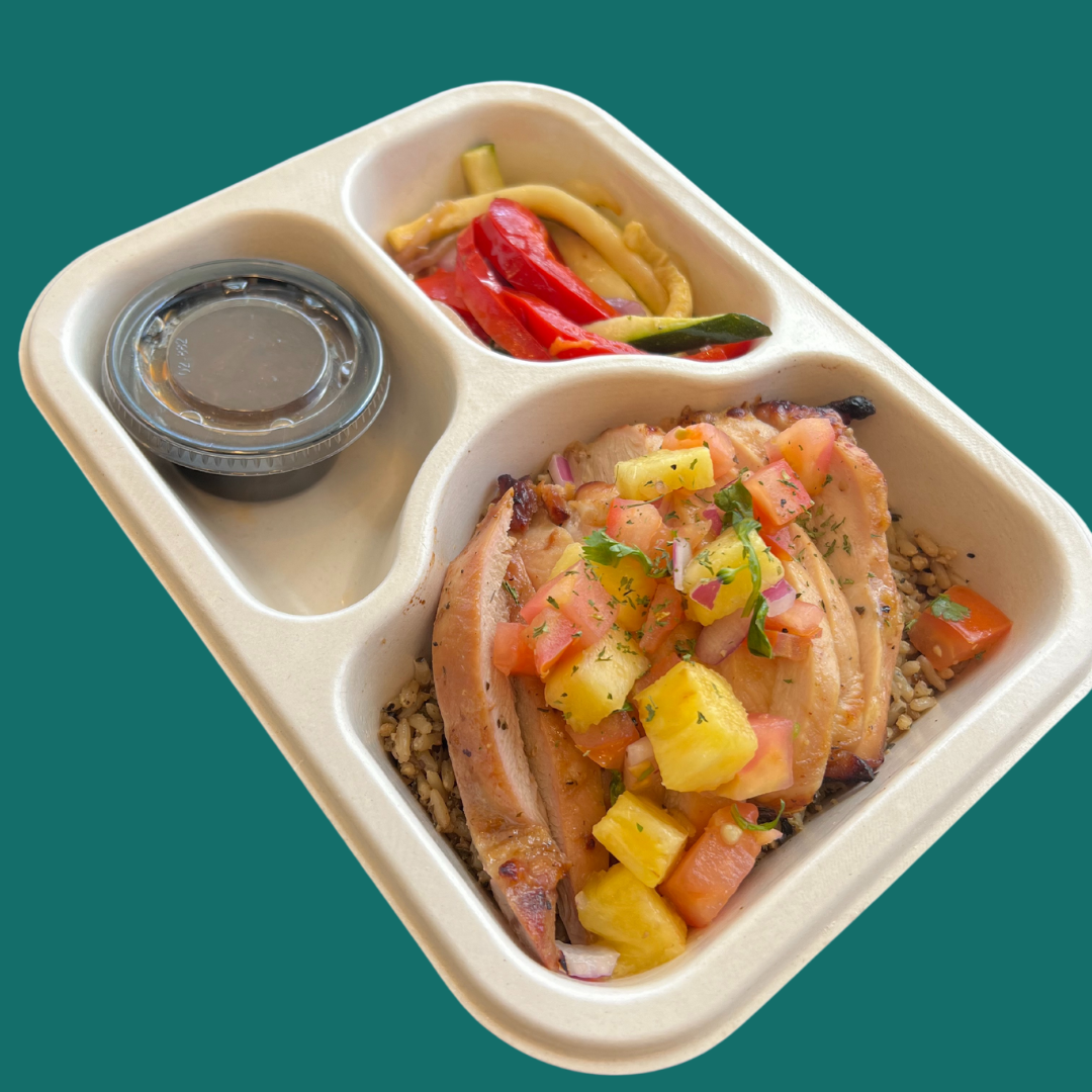 Indulge in a taste of Hawaii with our Hawaiian Chicken! Featuring tender, flavorful chicken thigh topped with sweet and tangy pineapple pico de gallo. Served over whole grain rice and accompanied by a side of mixed vegetables. A healthier twist on our classic "Taste of Hawaii" dish. Aloha!